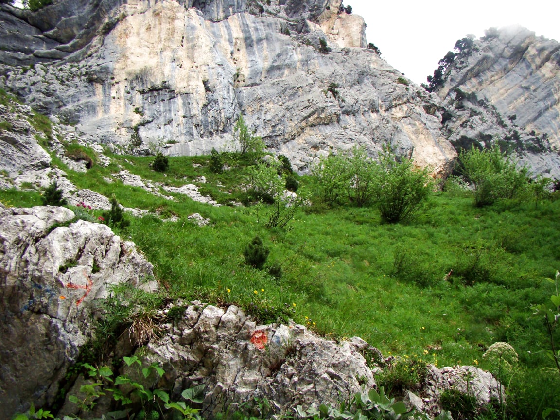 Sentier :  bien tracé jusqu'à la source, après pour le fourneau repérer les marquages sur les blocs rocheux des parois ou au sol (rouge-bleu).